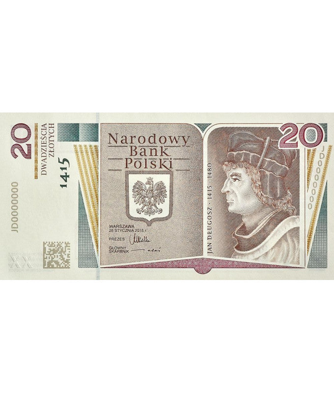Banknot kolekcjonerski 20 zł Jan Długosz wyemitowany został w 2015 roku przez NBP z okazji 600. rocznicy urodzin Jana Długosza. Jest to zarazem pierwszy banknot wyprodukowany na papierze umożliwiającym zastosowanie techniki grawerowania laserowego oraz wzbogaconym o kod dwuwymiarowy (2D). Dzięki niemu można natychmiast pozyskać informacje dotyczące banknotu oraz jego zabezpieczeń.