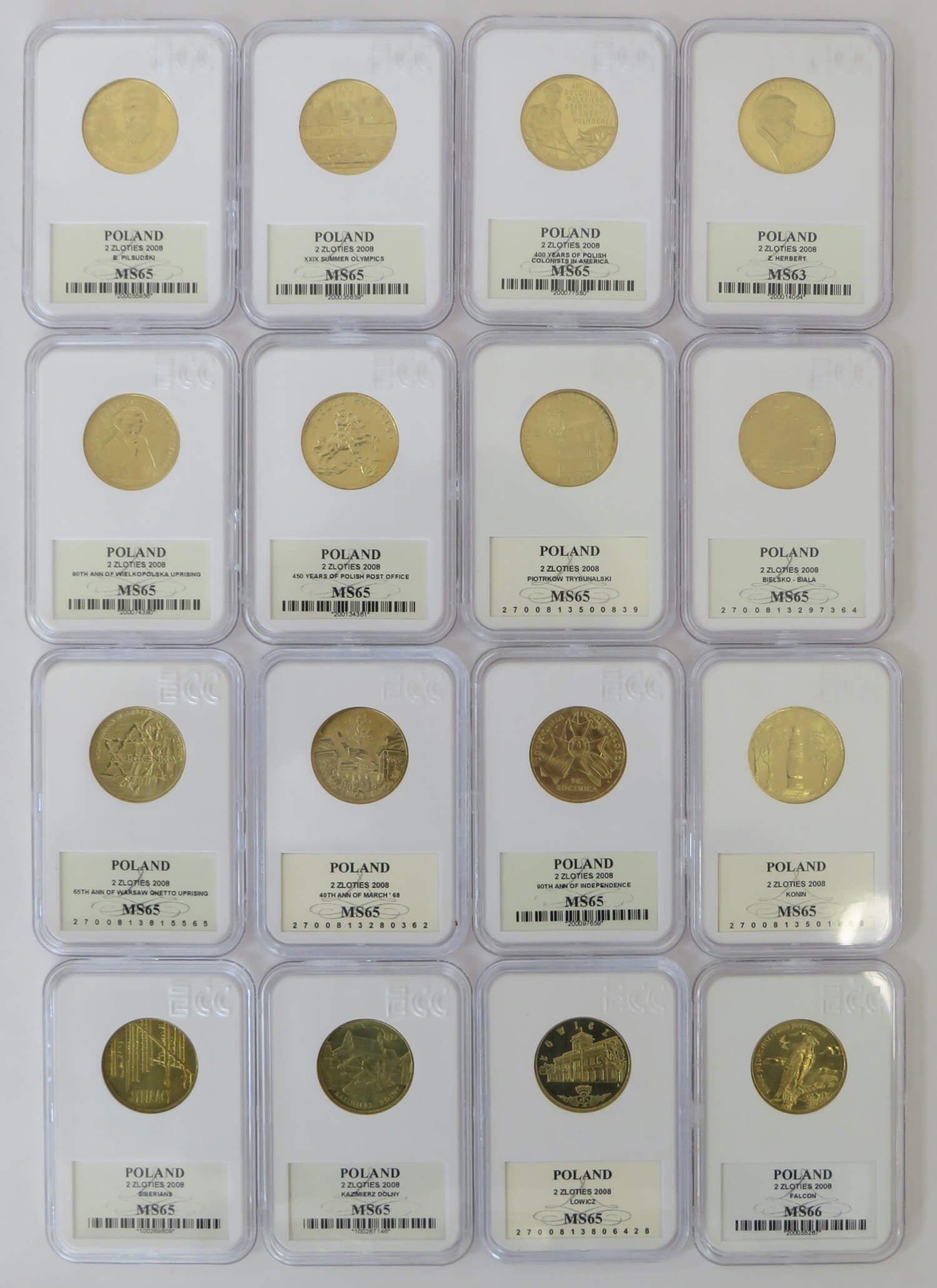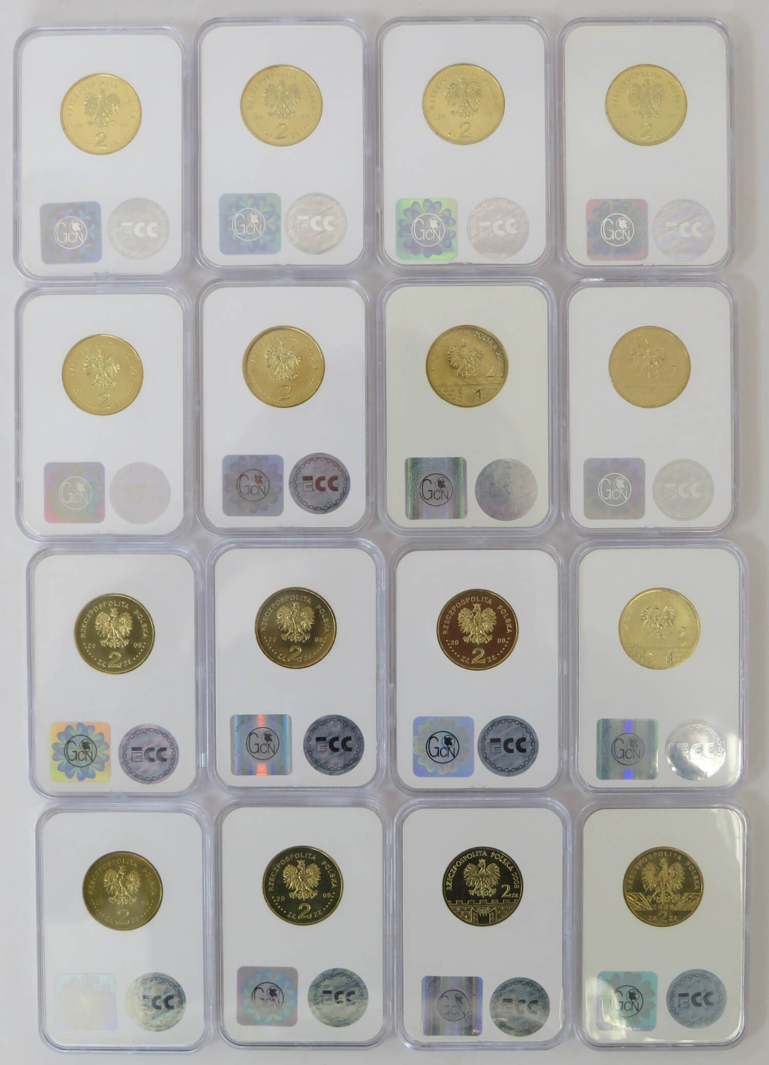 Pełny komplet 16 monet 2 zł GN rocznik 2008, grading GCN MS63-MS66, mennicze