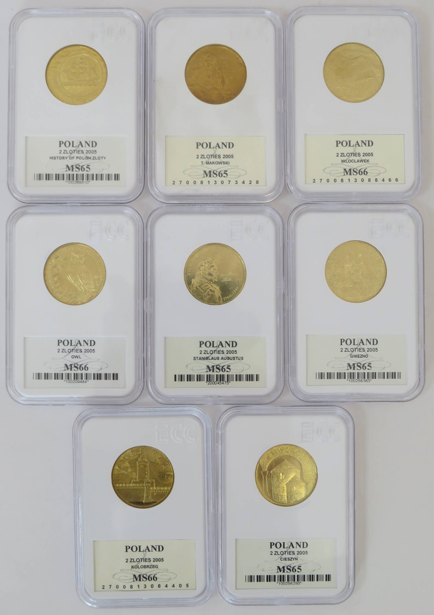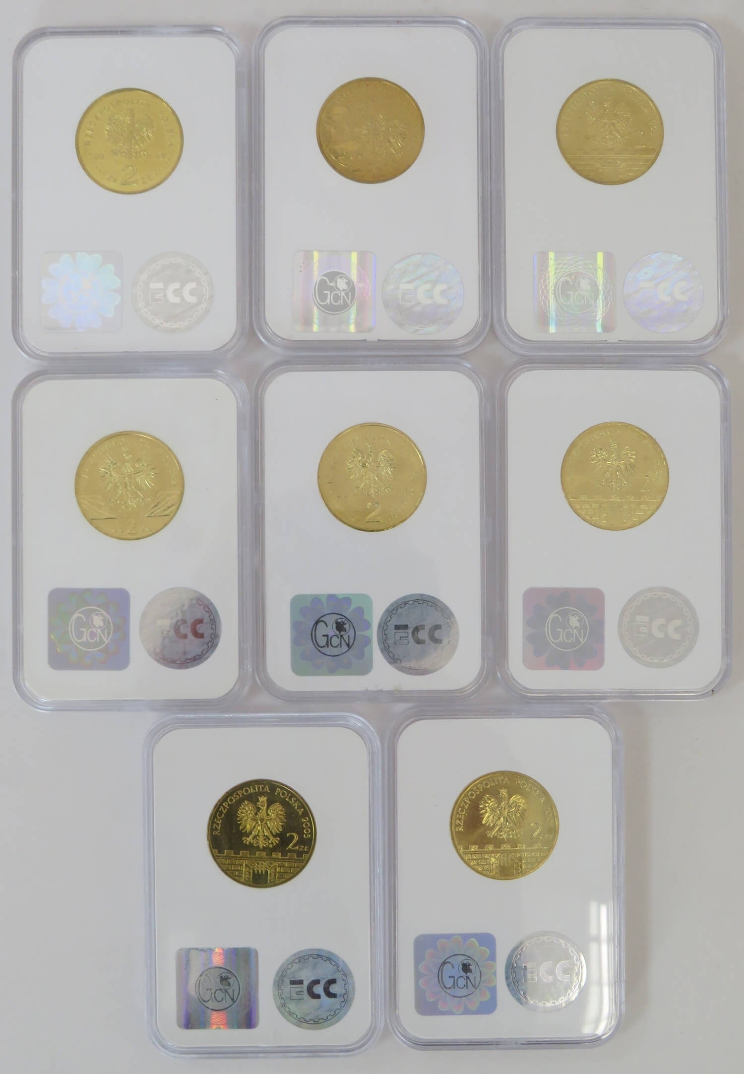 Zestaw 8 monet 2 zł GN rocznik 2005, grading GCN MS65-MS66, mennicze